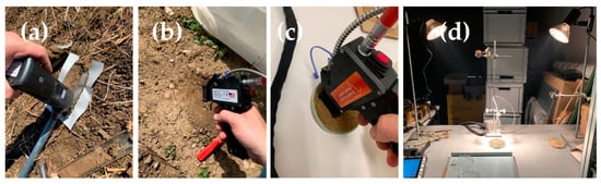Scanning setup for in situ spectra acquisition with the NeoSpectra Scanner (a) and with the PSR+3500 contact probe (b). The setup for laboratory spectra acquisition of only sieved (lab_sieved) soil samples (c) and finely ground (lab_fine) soil sample (d) with the PSR+3500 bare fiber.