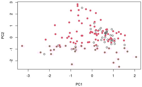 Visualization of the first two principal components (PC1 and PC2) of the dataset with the calibration (red dot) and the validation (circle) samples as selected by the Kennard–Stone algorithm for the PSR spectrometer. The ratio calibration/validation was of 70/30.