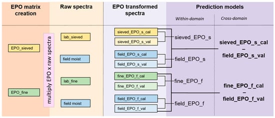 The EPO_sieved matrix (=EPO_s) was then used to correct both the in situ collected spectra (field moist) subset and the laboratory-based, sieved-only subset (lab_sieved) on the other hand. Equally, the EPO_fine matrix (also = EPO_f) was used to correct the field-obtained (field moist) spectra and the laboratory-based, sieved and finely ground spectra (lab_fine). This resulted in four new EPO-corrected datasets, each consisting of a calibration (_cal) and a validation (_val) subset, i.e., sieved_EPO_s and field_EPO_s (=respectively, the lab_sieved spectra and the field moist spectra corrected with EPO_sieved matrix) and fine_EPO_f and field_EPO_f (=respectively, the lab_fine spectra and field moist spectra corrected with the EPO_fine matrix). An overview over the EPO-corrected datasets and the applied models is given in Figure 3.