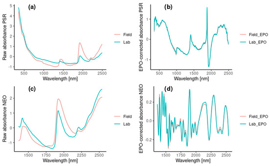 A visual comparison for an exemplary soil sample between the uncorrected and the EPO-corrected spectrum is given in Figure 4 for both the PSR and the NEO spectrometers. In the uncorrected spectra, we can clearly see the differences between the dried and field moist spectra, especially around the typical water related peaks at 1400 and 1900 nm in combination with absorption of other organic matter groups (amines, carboxylic groups around 1900 nm) or kaolinite (1400 nm) as well as a small water-related peak around 2200 nm [2,48,49] (Figure 4a,c). In the EPO-corrected spectra (Figure 4b,d), however, the differences are drastically reduced. For the PSR spectrometer (top), there are still few distinct peaks, again at around 1400 and 1900, among others, with the absorbance ranging from <−1 to >1. For the NEO spectrometer, on the other hand, there are many other small peaks and the absorbance ranges from <−0.2 to >0.2