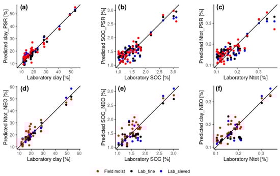 Laboratory versus predicted values from the validation set for the within-domain predictions for clay (a,d), SOC (b,e) and Ntot (c,f) for the PSR (a–c) and the NEO (d–f) spectrometer including the 1:1 line. The predicted values for the field-obtained (=field moist) model are displayed in red, for the lab_fine in black and for the lab_sieved in blue. For an overview of the modeling process, see Figure 3. For the level of accuracy of prediction, see Table 3 for the modelling “field moist”, “lab_sieved” and “lab_fine” for the two spectrometers and the three parameters.