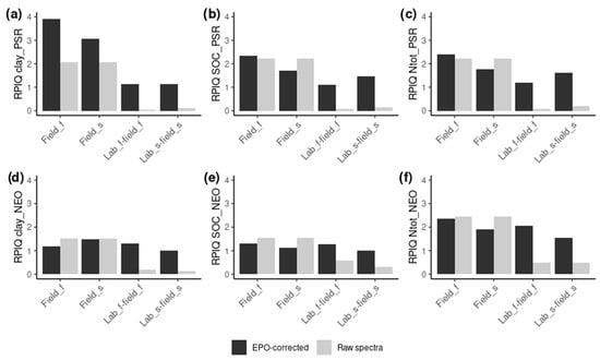 RPIQ values for uncorrected (raw) spectra (grey) and correspondent EPO-corrected spectra (black) for within domain predictions (field_f and field_s) and cross-domain predictions (lab_f-field_f and lab_s-field_s) for the PSR (a–c) and the NEO (d–f) spectrometers and for clay (a,d), SOC (b,e) and Ntot (c,f). The values of the raw field-obtained spectra (field_s and field_f) are the same and repeated for a better comparison.