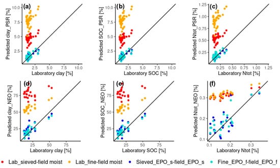 Laboratory versus predicted values from the validation set for the cross-domain predictions for clay (a,d), SOC (b,e) and Ntot (c,f) for the PSR (a–c) and the NEO (d–f) spectrometers including the 1:1 line. The predicted values for the uncorrected predictions are displayed in red for the lab_sieved-field moist model and in orange for the lab_fine-field moist model, whereas for the EPO-corrected models the predicted values are in dark blue for the sieved_EPO_s-field_EPO_s model and in light blue for the fine_EPO_f-field_EPO_f model. For an overview over the modeling process, see Figure 3 and Table 3.