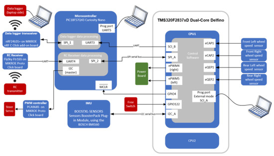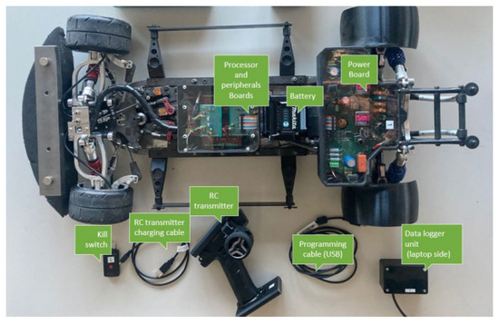 The DSP is equipped with a Texas Instruments (TI)eZDSP F28355 board (Dallas, TX, USA) and AMBER wireless data transfer system (Trier, Germany) that allows the data to be transferred to a PC with a frequency of 200 Hz through the data logger unit. The board is supported by Matlab embedded encoder. Hence, the control schemes can be directly implemented on Matlab and Simulink 2021b [26]. The program is implemented and uploaded on the vehicle through the USB programming cable. Last, the vehicle is equipped with the following sensors: