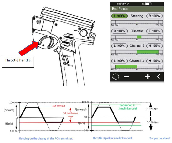 The torque setpoints for the left and right rear motor (from the control actions) are sent using PWM signals to the power board electronics. The full mechanical range of the throttle handle on the RC transmitter is mapped to a maximum of 0–100% value in the forward driving direction (pulling the handle) and 0–100% in the backward driving direction (pushing the handle). The reading on the display shows the current value. This mapping of the mechanical range is set by the End Point Adjustment (EPA) value. The throttle handle and torque generation are shown in Figure 3.