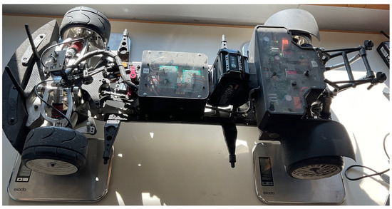 where and are the normal forces acting on the front and rear tire, respectively, obtained by the measurements conducted as in Figure 4. is the pitch mass moment of inertia, is the pitch acceleration, l is the wheelbase and m is the mass. Solving the equations above for each weight configuration allows to derive the corresponding a and b values representing the distance between the CoG and the front and rear tires, respectively, as shown below: