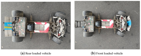 In order to investigate various loading conditions, weights were placed on the front and on the rear of the vehicle to achieve different CoG locations. More specifically, the weights have been attached to the tail (Figure 5a) and to the front bumper (Figure 5b) to maximize the change in weight. The set up for the testing vehicle with front- and rear-loaded weights is illustrated in Figure 5. The experiments were conducted on these two configurations as they represent the most extreme loading condition possible for the vehicle in consideration. In order to validate the yaw rate and wheel slip controllers, the tests were conducted on the unloaded vehicle shown in Figure 4.