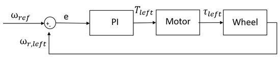 Since at very low speed () the slip value is not defined, the slip is achieved by upper bounding the speed of the rear wheel as a function of the front tire as shown in Equation (24). Next, a PI controller is designed such that the wheel slip is kept constant at the point where the maximum force can be developed. The controller takes the difference between the measured rear wheel speed and the reference () and minimizes the error according to Equation (17). In this case, the error is given as the difference between the rear tire velocity and the reference. The torque (e.g., output of the PI controller) is added to the input torque such that the error is minimized. Figure 7 shows the control scheme for the left tire only as the scheme is equivalent for both tires. T indicates the input torque (e.g., output of the controller), is the output torque (e.g., torque applied to the tire).