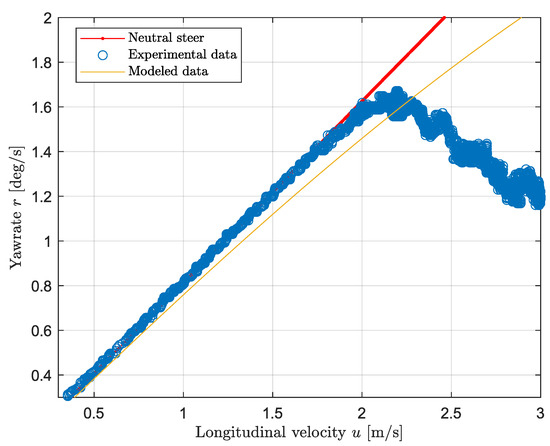 In order to determine the unknown values of the cornering stiffness, a constant cornering test is conducted. This consists of steady state driving with constant steering angle for different velocities ranging from 0 to 3 m/s. Higher velocities were not reached due to the tire friction limits. The steering angle used throughout the experiments corresponds to 24.3 degrees. By looking at Figure 8, it is possible to compare the vehicle behavior with respect to the model and the reference values. Initially, the vehicle’s yaw rate follows the neutral steer reference, then at approximately 2 m/s, the vehicle starts to under-steer as the yaw rate drops. In the linear region, the discrepancy between the model and the measurement data is negligible; however, as the non-linear region approaches, the error reaches a maximum of about 9% at approximately 1.7 m/s. In the non-linear region, where the yaw rate suddenly drops, the error suddenly increments linearly with the speed: this is due to the non-linearities of the tires that are not taken into account by the bicycle model. In order to validate the model, the cornering stiffness values have been tuned manually to minimize the discrepancy. Given that the car is understeering and approximately 60% of the weight is on the rear, solving Equation (11) for a negative understeer gradient leads to the relation of . As a result, the modeled value of the front cornering stiffness is equal to . More specifically the modeled value for the rear cornering stiffness is equal to 350 , while the front value is equal to 192.5 . The load configuration for this measurement is displayed by the “unloaded” case in Table 3.