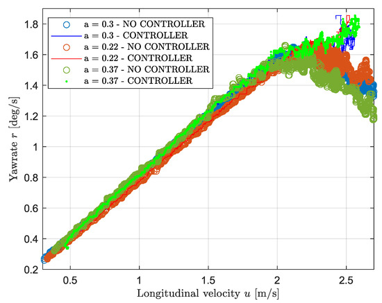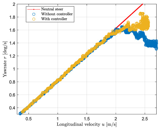 The loading conditions shown in Table 3 have been implemented for testing the vehicle performance for different weight configurations. In addition, the experiments have been performed with the yaw rate and wheel slip controllers. Figure 15 shows the yaw rate value as a function of the longitudinal velocity. By looking at the Figure, it follows that the same observation as in Section 3.2 can be gathered. In other words, implementing the controller improves the vehicle performance in the non-linear region of the tires for every loading condition. Moreover, it follows that approximately the same performance can be achieved for each configuration. Therefore, given that in the non-linear region, the configuration with the CoG moved rearward () has the lowest angular velocity, the most significant improvement can be seen in this configuration as the yaw rate is increased by approximately 30% at 2.5 m/s.