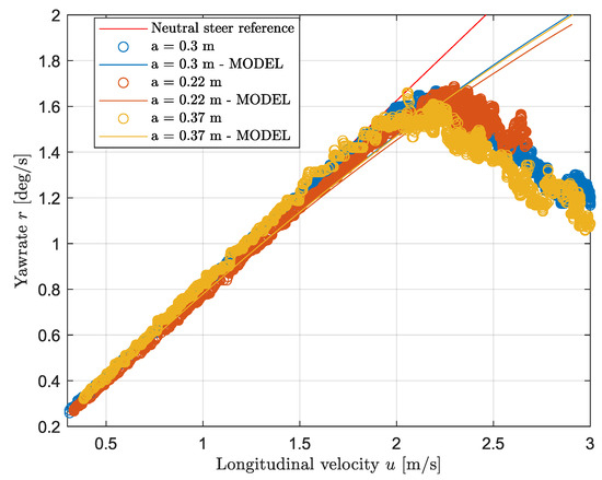 This subsection deals with the weight transfer analysis. Figure 10 shows the yaw rate as a function of velocity for both the modeled and the experimental data together with the reference for three weight configurations without applying any control systems. The loading conditions for this experiment are shown in Table 3, namely the case for corresponds to the “Loaded rear” case and is the “Loaded front” case. By looking at the figure, it follows that generally, for any weight configuration, the car shows understeering behavior at high speed as the yaw rate drastically drops at approximately 2.2 m/s. Next, both configurations for and show similar behavior at low speed: both cases show neutral steer behavior until the non-linear tire region ( 2 m/s) is entered, whereas the third configuration shows a higher mismatch with the reference. More specifically, when the CoG is moved forward, the vehicle starts to understeer at a lower speed: the error between the reference and the measured data reaches a value greater than 5% already at a velocity of 1 m/s, then it increases linearly with the speed. Regarding the peak values, shifting the CoG forward leads to a slightly higher maximum yaw rate achievable compared to the other cases, namely a 5% increase in the maximum yaw rate is achieved by shifting the CoG to the front by 16 cm. However, the peak value is reached at a slightly higher speed. Last, in the non-linear region, the configuration for m shows the lowest yaw rate for any given velocity, while moving the CoG forward leads to higher yaw rate values. More specifically, moving the CoG rearward by 15 cm leads to a decrease of the yaw rate approximately by 15% in the high speed region. To conclude, loading the front axle leads to a more severe understeering in the linear region while loading the rear axle reduces such behavior. However, the opposite phenomena appears at high speed as the lowest yaw rate is achieved when loading the rear axle. Furthermore, Figure 10 shows that the model matches the observation above; however, a mismatch with regard to the experimental data appears at high speed due to the linear nature of the model.