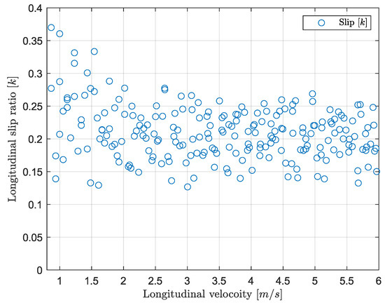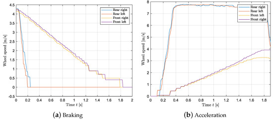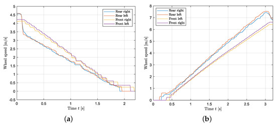 This paragraph deals with the validation of the slip controller. Figure 11a,b show the resulting measurements while braking and accelerating when the vehicle is unloaded, respectively. In order to evaluate the controller performance, a step of −2.5 Nm and 2.64 Nm is applied for braking and launching without applying a steering input, respectively. The loading condition corresponds to the “unloaded” case shown in Table 3. By looking at Figure 11a,b, it follows that the wheel slip controller prevents the driving wheels from locking and spinning as in Figure 12a,b. Figure 13 shows the values of the slip as the vehicle accelerates when the controller is applied as a function of velocity. It follows that constant slip of approximately 0.2 is achieved at all speeds. Since the wheels spin when the controller is not applied, it is not possible to calculate a reasonable value of slip using the methods above; however, Figure 12b shows that a very high difference in speed between the front and rear tires is achieved suggesting a high slip value. Hence, the wheel slip controller allows the vehicle to maximize the driving/braking force (see Equation (20)). An average deceleration of 2 m/s2 is achieved while braking, and an average acceleration of 2.3 m/s2 is reached when launching. Last, with a slip controller, the stability of the vehicle is highly increased as any unwanted yaw moment is rejected: Figure 14a,b show that when the wheel slip controller is not applied, the vehicle loses stability as a yaw moment is generated. Due to the nature of the experimental set up, the values of velocity and acceleration are given as an indication based on the testing results; they would be used to represent reasonable real-life values (after a scaling) for large-scale vehicles.