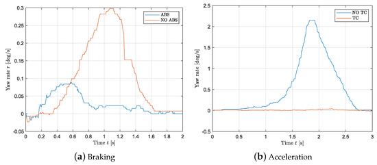 As shown in Figure 9, the cornering performance has improved as the yaw rate has increased up to 30% when the CoG is shifted to the rear. However, the effect of the controller is limited by the vehicle physical limits. When the force applied to the wheel exceeds the friction circle, the tires start spinning, hence the vehicle loses stability. Implementing a slip controller to prevent the wheel from spinning or locking while cornering will further improve the vehicle’s performance. Regarding the longitudinal motion, applying a wheel slip controller prevents the wheel from spinning and from locking, enhancing performance with regard to the braking distance and acceleration time and it greatly improves vehicle stability as any unwanted moment is completely rejected. However, throughout the experiments the same tires have been fitted to the vehicle and the tests were performed on a flat surface with a constant tyre road coefficient. The paper [32] suggest that to ensure the effectiveness of the control system, information of the peak tyre–road friction coefficient and adjustment of the slip ratios are fundamental. The implementation of a control algorithm based on the estimation of the tyre road friction may be beneficial in practice.