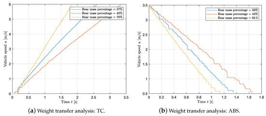 Last, an analysis of the vehicle’s longitudinal performance with a wheel slip controller for each weight configuration is conducted. Figure 16a and Figure 17a show the longitudinal velocity of the vehicle as a function of time while accelerating and braking for the three loading conditions, respectively. To evaluate the performance while accelerating, the vehicle has been loaded as in Table 3. The loading conditions throughout the braking tests are displayed in Table 4. The same inputs as in Section 3.4 are applied. From Figure 16, it follows that by shifting the CoG rearward, hence increasing the static vertical load on the rear axle, the vehicle shows a higher acceleration. Namely, for the braking case, increasing the rear weight distribution from 42% to 70%, leads to an increase of 48% in the average acceleration. According to Figure 17a, there is a linear relation between the maximum force developed by the tire and the vertical static force on the driving axle. Figure 16b shows the vehicle velocity for a launch with different weight configurations. The same conclusion as for Figure 17a can be drawn. The acceleration linearly increases with the vertical load on the rear axle. In this case, increasing the rear vertical load by 43% leads to an increase in acceleration from 1.78 m/s2 to 3.2 m/s2. As a consequence the braking and the acceleration distance are highly reduced when the CoG is shifted to the rear or the rear axle is loaded. Namely for the acceleration, increasing the rear mass percentage from 42% to 70% leads to a 50% decrease in the acceleration distance, while the braking distance is reduced by approximately 34% when the mass percentage on rear is shifted from 44% to 63.5%