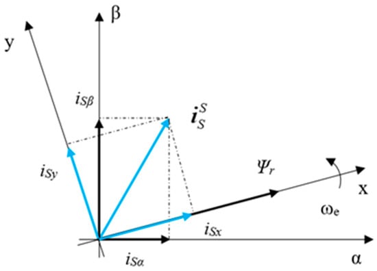 In the past, the operating speed of the IM was determined as a value of (less than) a rated speed corresponding to a rotor slip. Overcoming the limitations of classical control methods, modern control methods such as DTC and FOC are often used to meet the increasing demand for precise speed control in IM applications. The research model of IMD in this paper applies the FOC strategy for motor speed control. In the FOC method, a rotation coordinate [x, y] with the x-axis equivalent to the rotor flux is used to separate the stator current into two perpendicular components, iSx and iSy, as shown in Figure 1 [15]. The current component iSx will be controlled to maintain the rotor flux constant with the motor’s rated flux. On the other hand, the iSy current component is used to control the motor speed relative to the setting value.