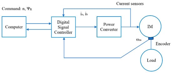 The general structure of the IMD includes the following main parts: a motor connected to the load, a power converter, a Digital Signal Controller (DSC), a computer, and the sensors corresponding to Figure 2. A detailed model of the IMD systems applying the FOC method integrating FTC functions against sensor faults is illustrated in Figure 3.