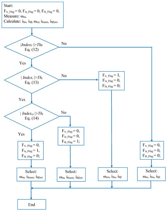 where ThF and Thi are all the maximum deviations of the current space vectors under normal operation conditions; these thresholds correspond to 10% of the rated current value, which is reasonable (refer to research papers and performed simulations). The sequence of the sensor fault diagnosis method is presented in the flowchart in Figure 5.