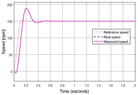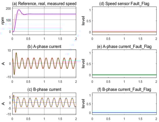 The proposed diagnostic technique based on current space vectors against the sensor failures is simulated in a Matlab/Simulink environment. The total failures according to three sensors are implemented to demonstrate the efficiency of the diagnostic methods. All motor parameters set for the simulation are listed as follows: rated power = 2.2 kW, rated speed = 1420 rpm, number of pole pairs p = 2, stator/rotor resistance = 3.179/2.118 Ω, and stator/rotor/mutual inductance = 0.192 h. Four operating modes of the drive are simulated, corresponding to a reference speed of 150 rpm, as shown in Figure 6. Where motor operation corresponds to the healthy mode of all sensors, the real speed coincides with the measured speed and follows the reference speed.