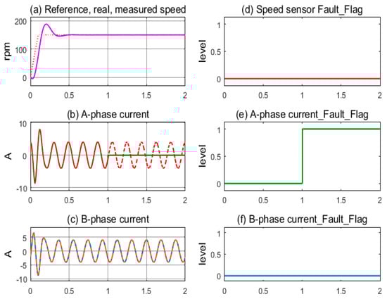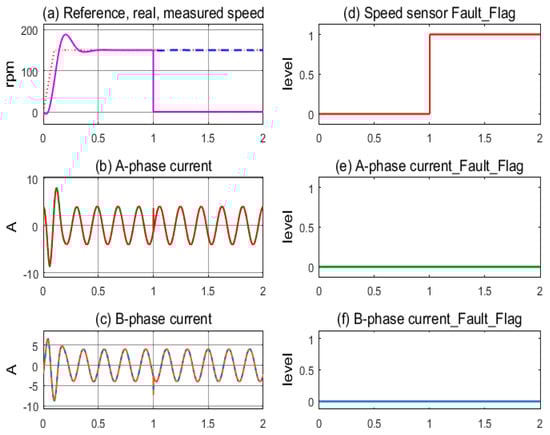 The first simulation, in Figure 7, demonstrates the stable operation of the motor drive system corresponding to the healthy sensors mode. The measured speed from the sensor and the motor’s actual speed coincide and follow the reference speed after overcoming the transient period; see Figure 7a. The sinusoidal currents of A-phase and B-phase sensors exhibit stability, as shown in Figure 7b,c. The sensor fault indicating flags are kept low, corresponding to the healthy state, as shown in Figure 7d–f. In Figure 8, the next simulation corresponds to the speed sensor fault occurring at 1.0 s in operation. The measured speed from the sensor and the motor’s actual speed coincide until 1.0 s, when the speed sensor fault occurs and the feedback signal is lost, resulting in the value transfer to the controller being zero, as shown in Figure 8a. The motor current fluctuates for a short time, causing the control command of the FOC controller to be chaotic, as shown in Figure 8b,c. The speed sensor’s fault flag is immediately pushed higher while the other two remain low; see Figure 8d,e. The FTC function is activated when the fault flag is high; the estimated speed immediately replaces the signal from the speed sensor. As a result, the IMD system maintains stable operation under the speed sensorless mode.
