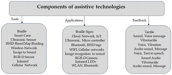 In addition to producing significant advances, various studies conducted over the past few years have improved the categories of assistive devices that have been produced and are currently in widespread use. To facilitate travel, assistive technologies are often categorized into three categories: electronic orientation aids, position locators, and electronic travel aids  devices. According to Elmannai et al. [], these categories include devices that collect and transmit environmental information to the user, devices that give directions to pedestrians in unfamiliar areas, and devices that pinpoint the exact location of the holder, respectively. A distinct classification of assistive technologies was put forth by Tapu et al. [] of perceptual tools that replace vision with other inputs from the senses, and conceptual tools that create orientation strategies to represent the environment and prepare for unforeseen circumstances during navigation.