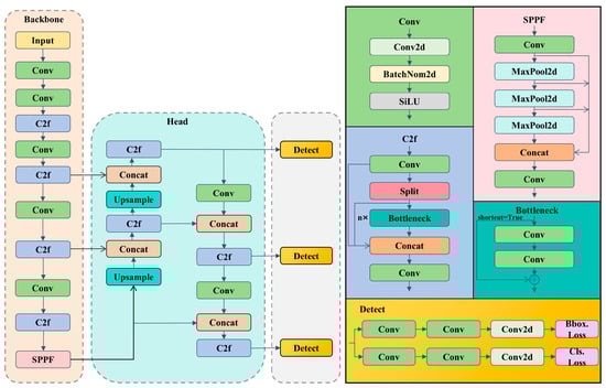 YOLOv8 adjusts the input image to 640 × 640 resolution. The Backbone consists of CBS, C2f, and SPPF modules. The CBS module includes Conv, BatchNormal, and SiLU, which realize the transformation and extraction of the input features; the C2f module captures the gradient flow information by using Bottleneck units; and the SPPF module reduces the computation and improves the feature extraction efficiency through the serial stacked pooling layer to reduce the computation and enhance the feature extraction efficiency. Head adopts the PANet structure to realize feature fusion and information transfer. Detect uses a decoupled Head to separate the regression and prediction branches. Through the DFL (Distribution Fusion Loss) strategy, the regression coordinates are regarded as distributions rather than single values, which helps the model deal with the defects of small scales or irregular shapes in a way that provides more accurate localization information.