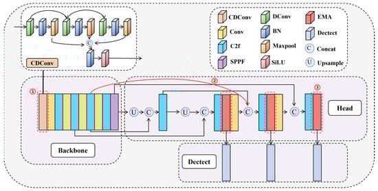 RSDNet is based on the YOLOv8n model, and the designed CDConv module is introduced in Backbone to realize multi-scale feature extraction. Drawing on the BiFPN idea in Head, a new fusion method is designed to enhance the network’s utilization of raw information. Meanwhile, EMA is fused to enhance attention to the defect information. Figure 2 illustrates the architectural design of the RSDNet model. Where ① denotes the designed CDConv module, ② denotes the designed feature fusion method, and ③ denotes the location where EMA is added.