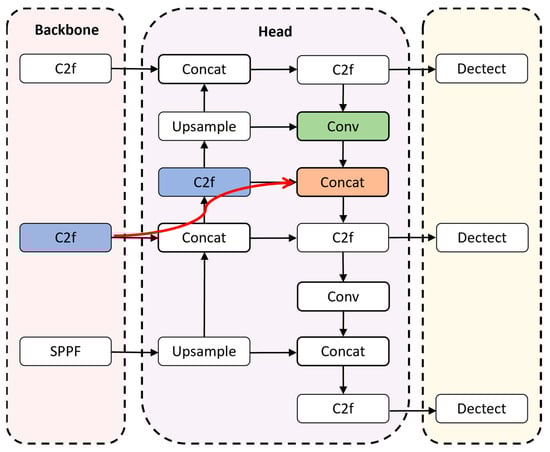 The improved feature fusion is shown in Figure 6. After the third C2f layer of the backbone, a new path is introduced to fuse the features extracted from this layer with the features from the first C2f layer of the Head part and the first Conv layer of the neck part. This design makes the raw, detail-rich features that have not been multiprocessed participate more in the feature fusion process, reduces the loss of information in the transfer process, and makes the model capture the defect detail information more acutely.