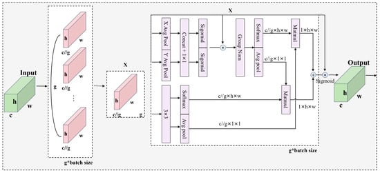 Due to the complex and variable background of the track surface and the difficulty in detecting subtle defects, the EMA attention mechanism is introduced in order to further enhance the screening and filtering abilities of the network on key information and improve the performance of the algorithm. EMA is a cross-space learning approach proposed by Daliang Ouyang et al., Efficient Multi-Scale Attention, that can interact with information without channel dimensionality reduction and reduce computational overhead [41]. Its structure is shown in Figure 7. In this image indicates an addition operation and indicates a multiplication operation.