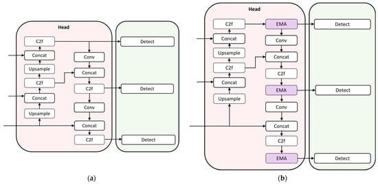 As shown in Figure 8, the EMA is combined with the three C2f connecting Detect in the Head. The EMA combines the C2f to ensure the full utilization of the features at each scale. The cross-space learning mechanism of the EMA is able to aggregate defect feature information from different branches. At the same time, EMA dynamically adjusts the weights in such a way that it can strengthen the key defect regions in the track surface feature map and ignore irrelevant background information, so as to improve the accuracy of track surface defect detection.