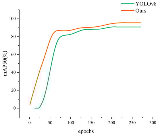 The mAP is the area enclosed by the mapping of precision and recall on the two axes. In the experiments in this paper, the mAP curves of the initial YOLOv8n model and the improved YOLOv8n model are shown in Figure 10. These curves depict the performance trend of the two models during the training process. As can be seen from the figure, the mAP curves of the improved YOLOv8n show a clear upward trend throughout the training process, which indicates that the performance of the model is steadily improving with the training. After sufficient training, the mAP curve finally stabilizes at a higher plateau, indicating that the model’s performance has reached its peak. The mAP of the original YOLOv8 is 90.8%, while the mAP of this paper is 95.4%, which is 4.6% higher.