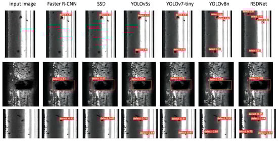 As shown in Table 5, the algorithm significantly outperforms the traditional Faster R-CNN and SSD algorithms for rail surface defect detection. Compared with the YOLOv5s, YOLOv7-Tiny, and YOLOv8n models in the YOLO family, the improved algorithm achieves 5.6%, 7.4%, and 4.6% on mAP@0.5. The inference time is 2.5 ms faster than YOLOv5s, but 0.4 ms and 1.3 ms slower than YOLOv7-Tiny and YOLOv8n, respectively. In addition, the algorithm also demonstrates high levels of accuracy and recall, two key performance metrics. These results fully validate the accuracy and stability of the RSDNet model in the task of rail surface defect recognition, which meets the practical needs of rail inspection.