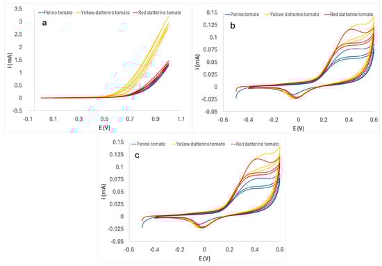 Cyclic voltammetry of the different tomato purée samples using (a) CNP, (b) GNP, and (c) PEDOT-modified SPCEs.
