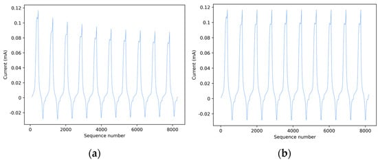 An obvious observation is that in the current vs. potential representation of a scanning cycle, each measurement cannot be considered a sample of a function I = f(V) since the values of current I corresponding to a given potential V are different when measured during the forward and backward scans, evidencing a hysteresis-like behavior. This could represent a problem for ML algorithms, which should treat the input as a two-dimensional data set. Models developed to explicitly deal with spatial representations are not appropriate for this case since the measurements, consisting of signals from single electrodes, are inherently monodimensional. For these reasons, measurement time series representing current vs. potential relationships were transformed into relationships between current vs. sequence number, as shown in Figure 2.