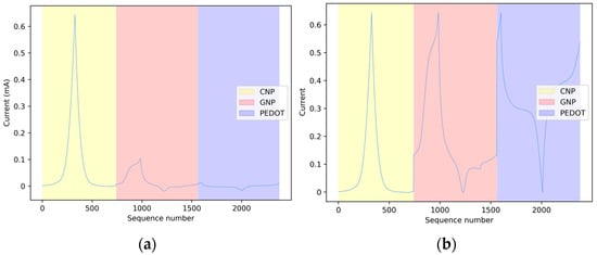 Furthermore, to collect the full range of information on a measurement, single CV scans from each of the three sensor types, as those represented by the peaks in Figure 2, were concatenated to create a unified data set. Each sample of this data set is the result of the concatenation of three scans acquired by the CNP-, GNP-, and PEDOT-modified SPCEs, respectively, as shown in Figure 3a.