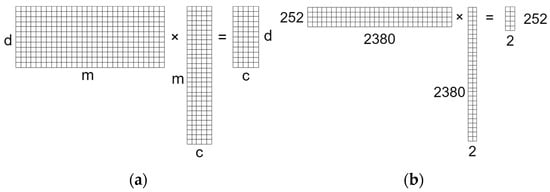Graphical representation of the multiplication between the dataset matrix and the transformation matrix and the resulting transformed matrix. (a) Representation of the general case corresponding to Equation (4); (b) Representation of the specific case at hand using a two-component transformation matrix.