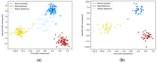 Two-component LDA representation of the training set (a) and test set (b) relevant to tomato purée classification by cultivar.