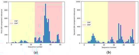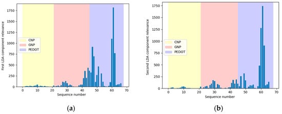 Relevance of the features of the first (a) and the second (b) component of the transformation matrix relevant to tomato purée classification by cultivar after excluding data from the PEDOT sensor.