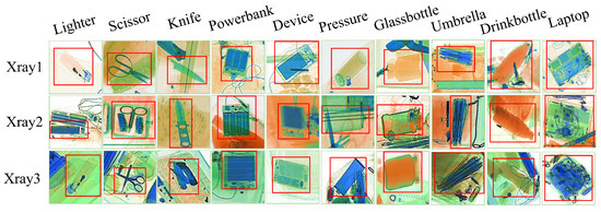 GDXray is the first complete dataset that can be used for the detection of prohibited in X-ray security screening, which consists of 19,407 X-ray images. However, this dataset is a greyscale image captured by a single energy X-ray screening machine, and the images scanned by the present X-ray screening machines are all pseudo-colour images, and thus, it does not conform to the present state of research. The SIXray dataset comprises 1,059,231 X-ray images depicting prohibited across six categories: guns, knives, spanners, pliers, scissors, and hammers. However, the dataset faces challenges due to the relatively small number of images containing prohibited, coupled with significant disparities in the quantities of different types of prohibited represented. The OPIXray dataset contains 8885 X-ray images of five different types of objects, namely utility knives, folding knives, utility knives, scissors, and straight knives, with three different levels of occlusion, aimed at investigating occlusion and overlap problems. However, there is a lack of diversity in the dataset as the object objects all belong to the knife category. The HiXray dataset comprises 45,364 X-ray images depicting 102,928 commonly prohibited objects across eight categories. However, among the eight categories, only lighters and rechargeable batteries are prohibited objects.