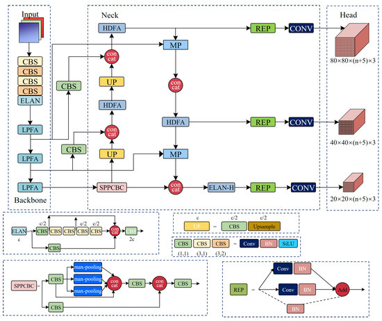 As the state-of-the-art in the field of image recognition and object detection, YOLOv7 [25] combines extended E-ELAN networks, layer aggregation networks, and composite model scaling strategies. It delivers 5 to 160 frames per second without compromising accuracy in image recognition and object detection. Compared to other YOLO algorithms, YOLOv7 offers the best balance between detection speed and accuracy. By replacing the C3 module in YOLOv5 with the more lightweight C2f module, YOLOv8 [26] achieves a further improvement in network performance. Despite retaining the SPPF module and the design concept of PAN in the YOLOv5 architecture, YOLOv8 simplifies the network structure by removing the convolutional structure of the sampling stage on the PAN-FPN. In addition, YOLOv8 introduces the decoupled-head design with anchor-free detection, which enhances the flexibility and accuracy of the detection algorithm. Notably, YOLOv7 enhances detection accuracy through various improvements, including advancements in the backbone network and feature fusion methods. By incorporating additional feature layers, YOLOv7 is able to capture finer details of the targets, providing a significant advantage in handling complex scenes and diverse objects. Furthermore, YOLOv7 achieves faster detection speeds while maintaining high detection accuracy, making it an exceptionally efficient model for practical applications. Therefore, YOLOv7 is chosen as the baseline model in this study.