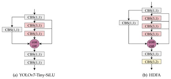 Only optimizing the backbone feature extraction network of YOLOv7 obviously cannot achieve a better lightweight effect. Therefore, the HDFA module is proposed in this paper for optimizing the neck feature fusion network of YOLOv7-Tiny-SiLU. YOLOv7-Tiny-SiLU is a compact variant of YOLOv7, which adopts the streamlined network architecture and uses the SiLU activation function on top of the Leaky ReLU. The comparison between the HDFA module and YOLOv7-Tiny-SiLU is shown in Figure 4, where a 3 × 3 convolution is additionally added to the original to improve the feature integration capability of the network. Considering that the neck feature fusion network part is directly connected to the detection head part, if the integration of the features is not strong, it will make the network accuracy decrease and the prediction of the object is not good. The additional 3 × 3 convolution is used because the number of channels in the neck feature fusion network part is small, and even adding a convolution does not result in a very large amount of computation.