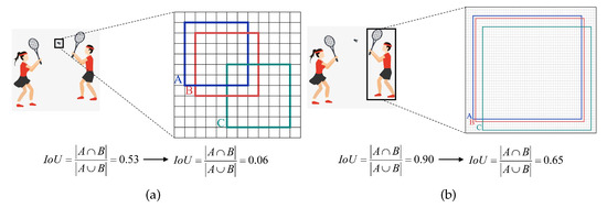 We conduct an analysis of the IoU sensitivity focusing on small- and normal-scale objects. In this analysis, each grid cell represents one pixel. Box A represents the ground truth bounding box, while Boxes B and C illustrate predicted bounding boxes with diagonal biases of one pixel and four pixels, respectively. Specifically, (a) pertains sto the detection of micro-scale objects, whereas (b) relates to the detection of normal-scale objects.