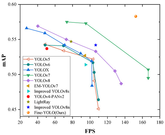 To further validate the efficacy of Fine-YOLO, we compare it with the X-ray prohibited object detection algorithm on the EDS dataset, and the results are presented in Table 2. The methods in the table are all lightweight X-ray prohibited detection methods. The experimental results confirm that our model not only maintains superior detection accuracy, but also reduces model complexity and accelerated detection speed. In summary, Fine-YOLO achieves an excellent balance between lightweight design, high detection accuracy, and rapid detection speed. Its excellent performance in small and large model variants demonstrates that it is an advanced lightweight inspection solution. Figure 7 provides a more intuitive representation of the superiority of our proposed Fine-YOLO algorithm.