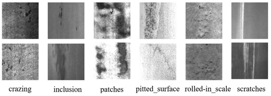 In order to more comprehensively evaluate the performance of Fine-YOLO on different domain datasets and the effectiveness of the proposed improvements on complex background information and small object detection, the NEU-DET dataset is selected for comparative analysis in this paper. The dataset consists of 1800 images containing six different types of surface defects: cracks, inclusions, spots, pitted surfaces, rolled-in scales, and scratches, as shown in Figure 8. In this study, the dataset is split into a 9:1 ratio of training set to test set. The training set is then subdivided into a 9:1 ratio to yield a training subset of 1458 images, a test subset of 180 images, and a validation subset of 162 images.