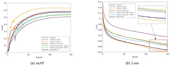 In this section, we methodically examine the impact of three enhancement techniques on the network model. The experimental findings are detailed in Table 4. Initially, we evaluate the effectiveness of enhancing the backbone feature extraction network using YOLOv7 as the baseline model. Second, the impact of the improvement on the neck feature fusion network is evaluated using YOLOv7-Tiny-SiLU as the baseline model. Subsequently, the effectiveness of the cross-layer connection network is validated. Finally, the NWD loss function is introduced along with a comparison with the performance of YOLOv7. Ten sets of experiments are conducted incorporating different modules, and their performance is evaluated using mAP, Parameters, GFLOPs, and FPS as metrics.