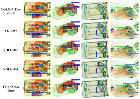 This section provides a comprehensive comparison between Fine-YOLO and several classical detection algorithms, as shown in Table 1. The second-stage object detection algorithm, Faster R-CNN, is too slow due to its large number of parameters. SSD has a faster detection speed compared to Faster R-CNN; however, its performance in terms of detection accuracy is very unsatisfactory. RetinaNet is 6.9% higher than SSD in terms of the mAP metrics, although it is nearly twice as slow as SSD in terms of detection speed. The anchor-free family of object detection algorithms, such as CenterNet and FCOS, cannot strike a good balance between detection accuracy and detection speed. In the YOLO series, smaller models such as YOLOv5-S, YOLOX-Nano, and YOLOv8-S, while more lightweight in structure, are not comparable to the Fine-YOLO in terms of detection speed and accuracy. This discrepancy can be attributed to the impact of various factors on model detection speed, including model structure, optimization techniques, hardware efficiency, and implementation details. Despite having fewer parameters, these models may employ more complex network structures or model designs, resulting in greater computational resource requirements and longer inference times. In contrast, Fine-YOLO strikes a balance between model complexity and computational efficiency by optimizing feature extraction, thereby reducing overall execution time. Compared to models such as YOLOv7-Tiny and YOLOv7-Tiny-SiLU, Fine-YOLO provides significant advantages in terms of detection accuracy, speed, and lightweight design for X-ray datasets, despite a slight increase in computational complexity. Moreover, when compared to larger-scale models such as YOLOv5-L, YOLOX-L, YOLOv8-L, and YOLOv7, Fine-YOLO stands out due to its lighter network architecture, faster detection speed, and superior detection accuracy.