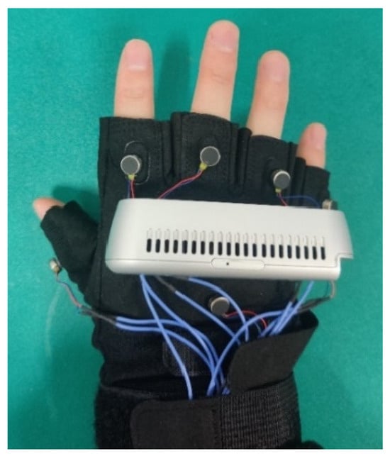 As visually impaired individuals need to perform grasping actions with their hands, it is necessary to obtain the relative position between the target object and the hand coordinate system. Since the coordinates of the camera and the target object can be obtained through the semantic SLAM algorithm in the visual perception module, the camera is fixed to the visually impaired person’s hand by overlapping it with the hand, thereby obtaining the coordinate information of the target object relative to the visually impaired person’s hand. In order to fix the camera to the visually impaired person’s hand, this paper uses a half-fingered glove made of special nylon and super fiber as the basis for the wearable device. The camera of the visual perception end and the vibration array used for tactile interaction are fixed to the back of the glove with 3M high-viscosity double-sided tape, as shown in Figure 3.