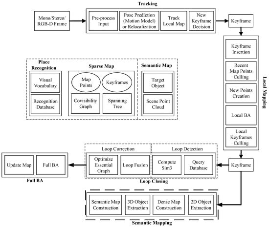 The feature point-based visual SLAM algorithm is used in this paper to implement semantic SLAM. ORB-SLAM2 is one of the most widely used and high-performance algorithms in feature point-based methods. This algorithm can be used for monocular, stereo, and RGB-D visual SLAM and has the functions of relocalization and loop closure detection. This paper uses ORB-SLAM2 as the basic framework to implement semantic SLAM required for the visual assistance system, which not only constructs a sparse map of the scene and locates the hands of visually impaired individuals but also builds a semantic map that includes semantic information of target objects, i.e., to obtain the location information of target objects.