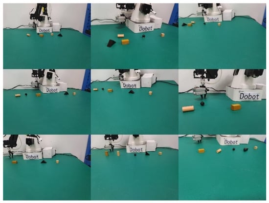 A total of 435 sample images were collected in the experimental environment, and nine image datasets were collected, as shown in Figure 6. After collecting the dataset, each sample was labeled, including annotating the categories of all targets in the sample and the information of the rectangular bounding box. The LabelImg open-source tool was selected for dataset annotation because of its graphic interaction interface. The labeling format was set to YOLO format, and the labeling results were saved in a corresponding txt file. After labeling, the dataset was divided into training and testing sets in an 8:2 ratio, which was used to estimate the network model parameters and evaluate the network model’s performance during the training process, respectively.