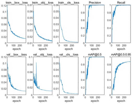 After training, the weight file of the YOLO V5s model was obtained. The changes in various losses and indicators during training are shown in Figure 7. It can be seen that with the increase in iteration number, the losses in the training set and test set gradually decrease, while the precision rate P, recall rate R, and mAP gradually increase and eventually converge.