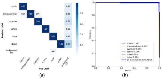 Meanwhile, the confusion matrix and PR (precision–recall) curve for the detection results of the six types of objects, including the rectangular parallelepiped, triangular prism, cylinder, sphere, cube, and Dobot manipulator, were plotted on the test dataset, as shown in Figure 8. In a small portion of images in the test dataset, the background may be predicted as the target object, but overall, the classification performs well. The PR curve indicates that the YOLO V5s model trained in this study achieves the highest AP0.5 of 99.6% and an mAP0.5 of 99.3% for all categories, indicating that the model not only has high accuracy but also has high recall and a low probability of missing detections, meeting the requirements of the assistive system for the visually impaired.